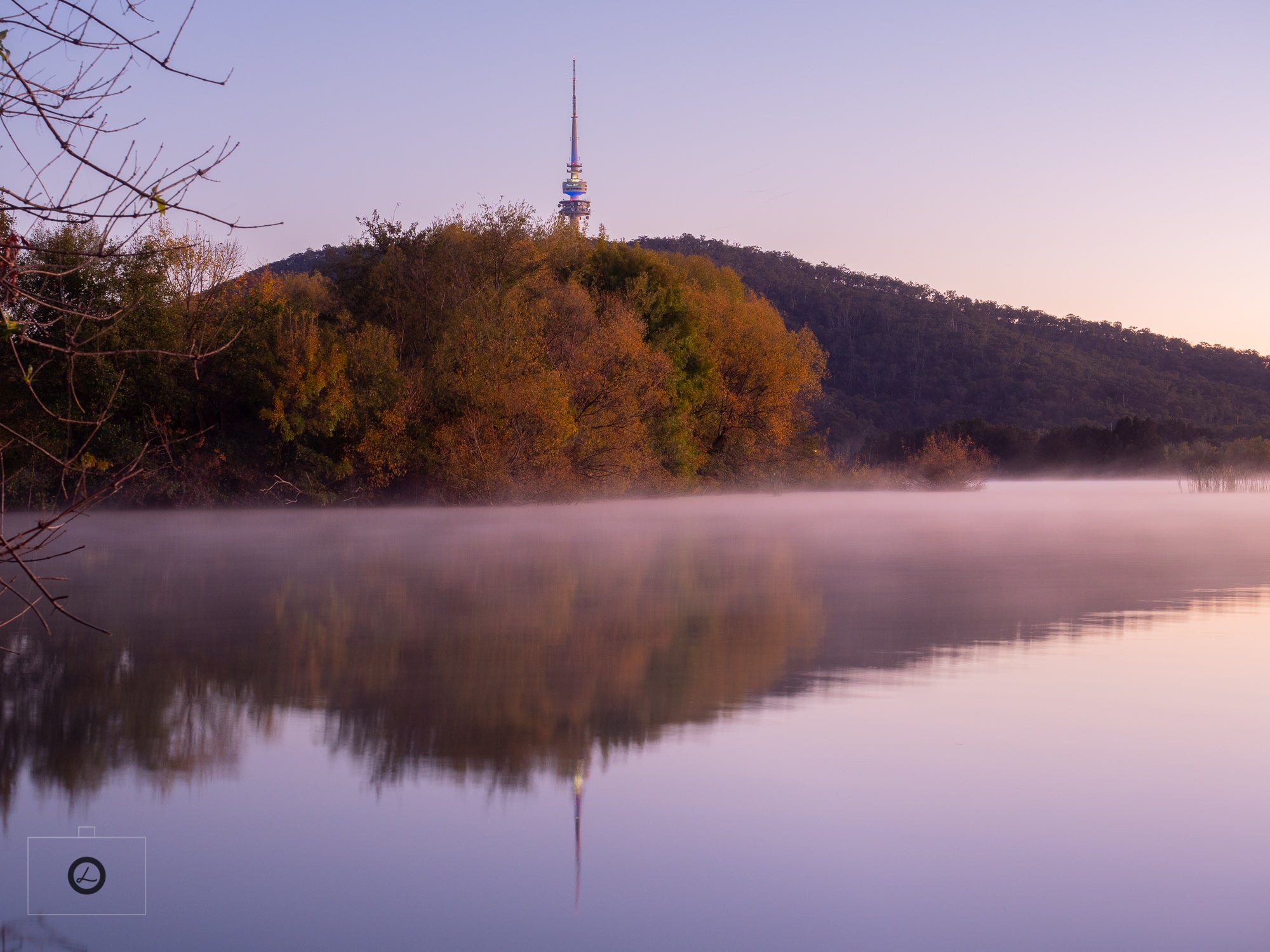 The autumn hues meet a gentle sunrise on Canberra's Lake Burley Griffin. The still lake provides the perfect mirror.